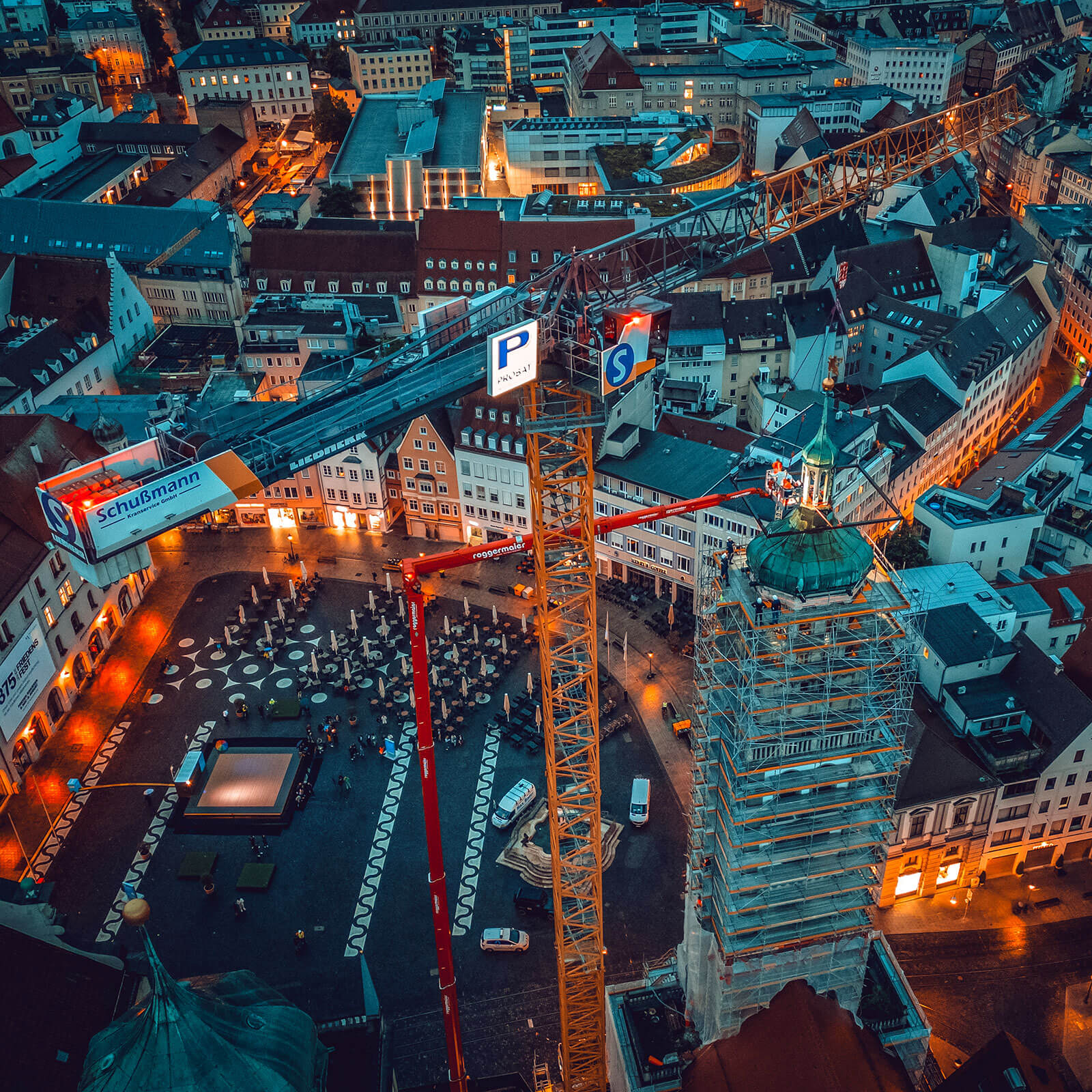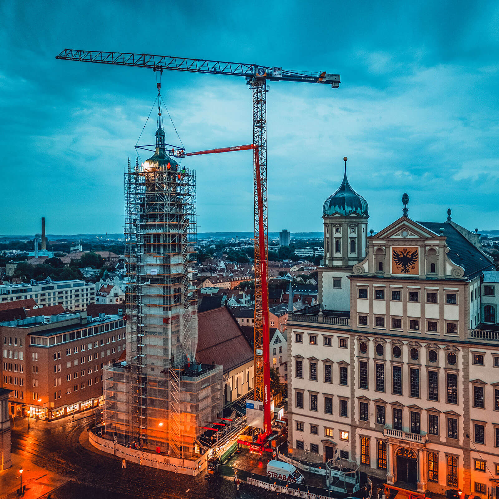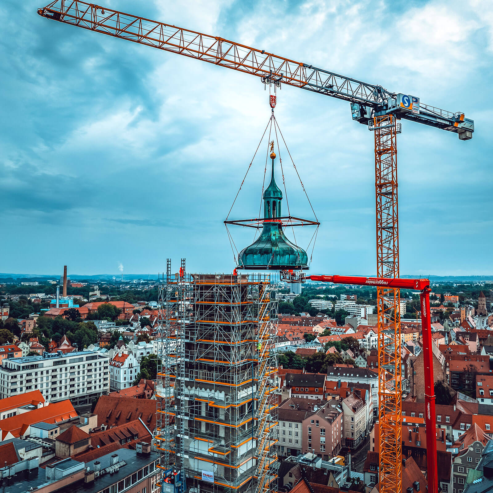 Der Abbau der Kuppel des über 1000 Jahre alten Perlachturms im Herzen von Augsburg. Eine Maßnahme, die so in der Geschichte dieses Wahrzeichens noch nie durchgeführt wurde – und die höchste Präzision, perfekte Planung und ein eingespieltes Team erforderte.