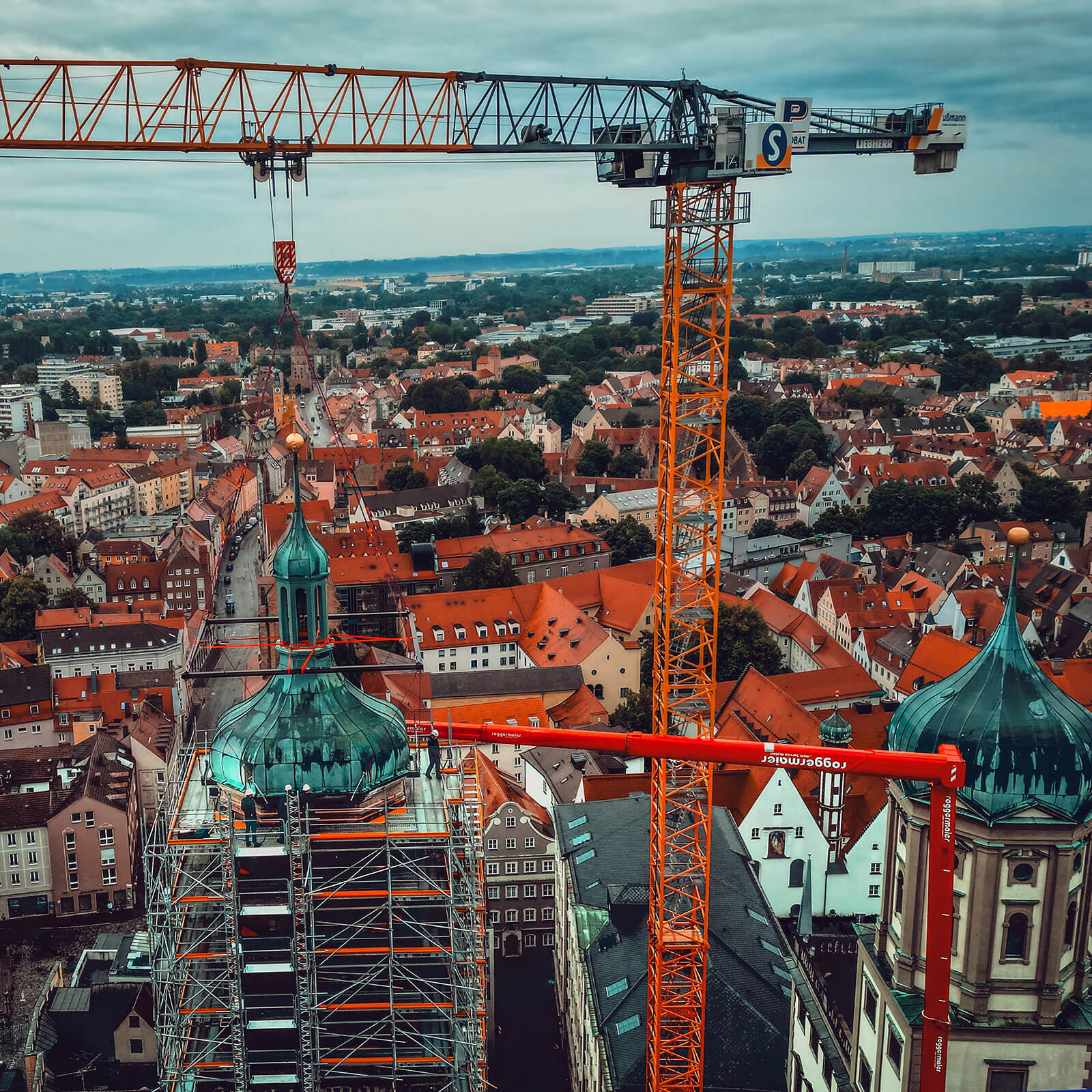 Kran von Schußmann für die Renovierungsarbeiten am Perlachturm
